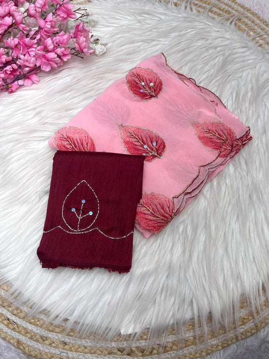 Bollywood Style Wetless Jari Print Maroon Colored Saree with Khatli Handwork & Mono Banglori Blouse