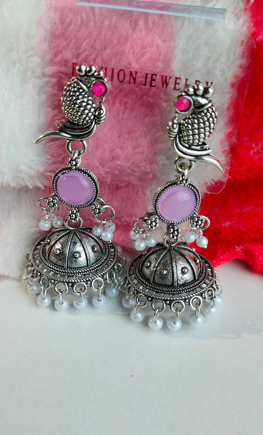 Oxidized Silver Peacock Jhumka Earrings with Pink Stone & Pearl Drops – Traditional Ethnic Jewelry for Women