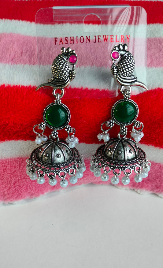 Oxidized Silver Peacock Jhumka Earrings with Green Stone & Pearl Drops – Traditional Ethnic Jewelry for Women