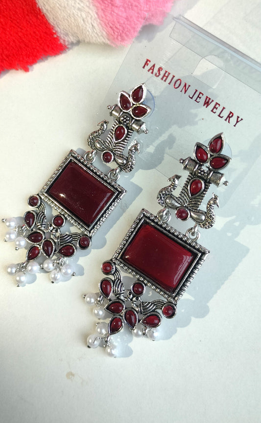 Oxidized Silver Peacock Dangler Earrings with Maroon Stone & Pearl Drops – Ethnic Party Wear Jewelry for Women
