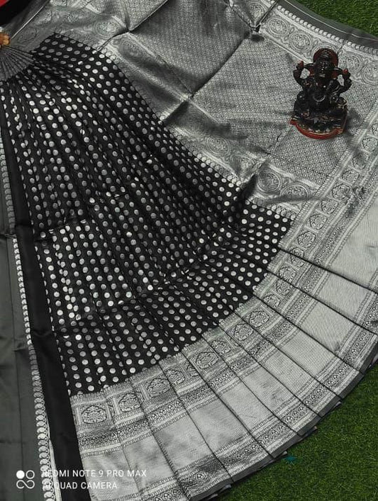 Premium Black Colored Soft Lichi Silk Saree with Rich Pallu & Contrast Jacquard Border Blouse