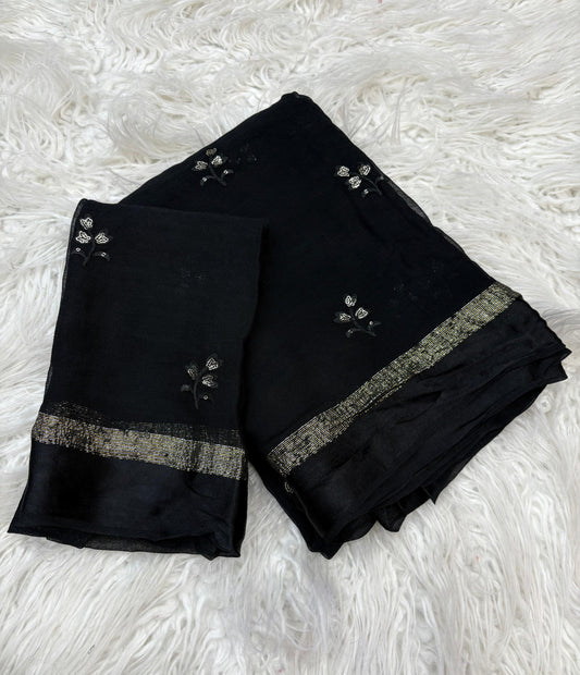 Pure Viscose Georgette Black Colored Saree with Satin Border & All Over Embroidery