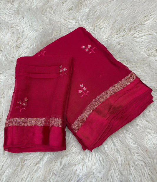 Pure Viscose Georgette Rani Pink Colored Saree with Satin Border & All Over Embroidery