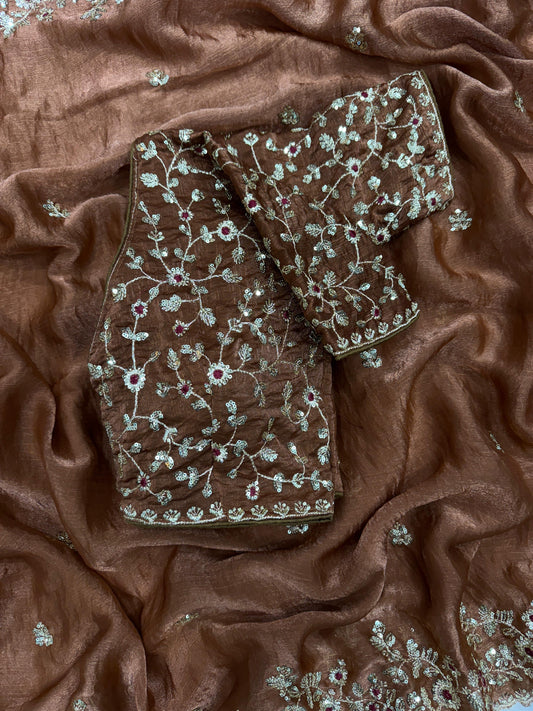 Premium Frendy Chiffon Brown Colored Sequins Embroidered Saree with Heavy Sequins Blouse