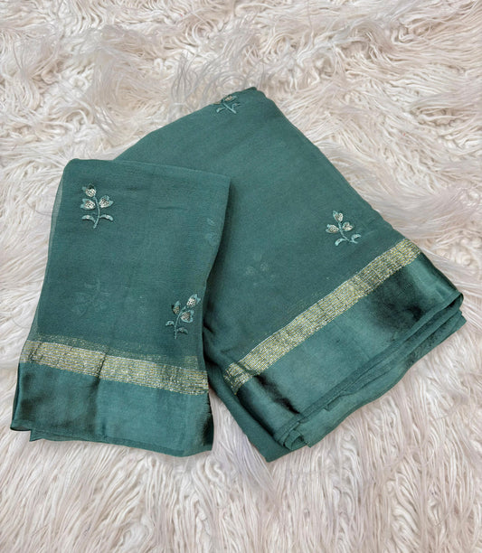 Pure Viscose Georgette Turquoise Colored Saree with Satin Border & All Over Embroidery