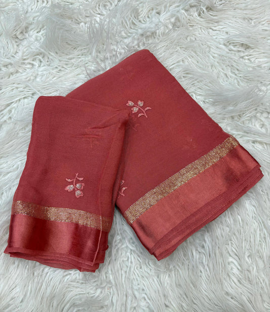 Premium Frendy Chiffon Peach Colored Sequins Embroidered Saree with Heavy Sequins Blouse