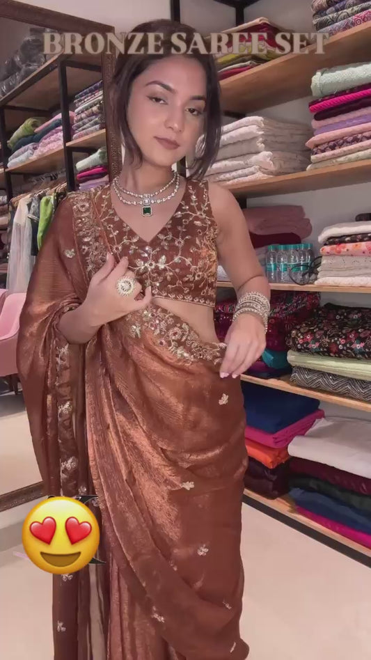 Premium Frendy Chiffon Bronze Colored Sequins Embroidered Saree with Heavy Sequins Blouse
