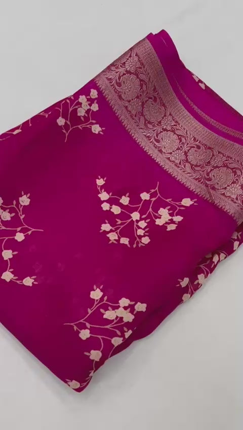 Step into timeless elegance with our exclusive printed Calcutta Moss Mellow Georgette sarees, crafted to perfection for today’s modern yet traditional woman. Each saree features a fine zari woven border that adds a luxurious touch to its graceful drape, making it ideal for both festive celebrations and special occasions.