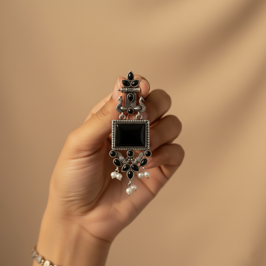 ✔ Oxidized Peacock Dangler with Black Stone - Material: Premium Oxidized Silver Alloy