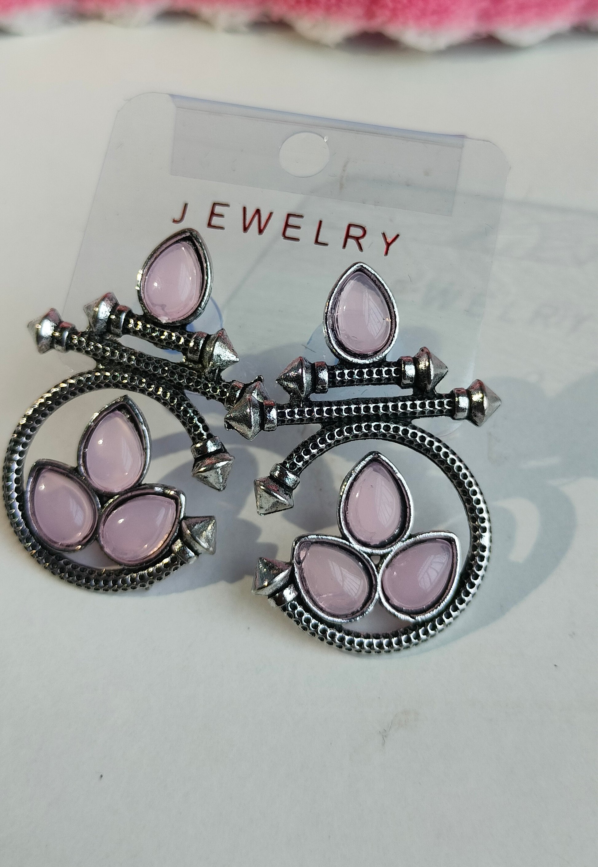 Designer Oxidised Silver Earrings with Light Pink Stones