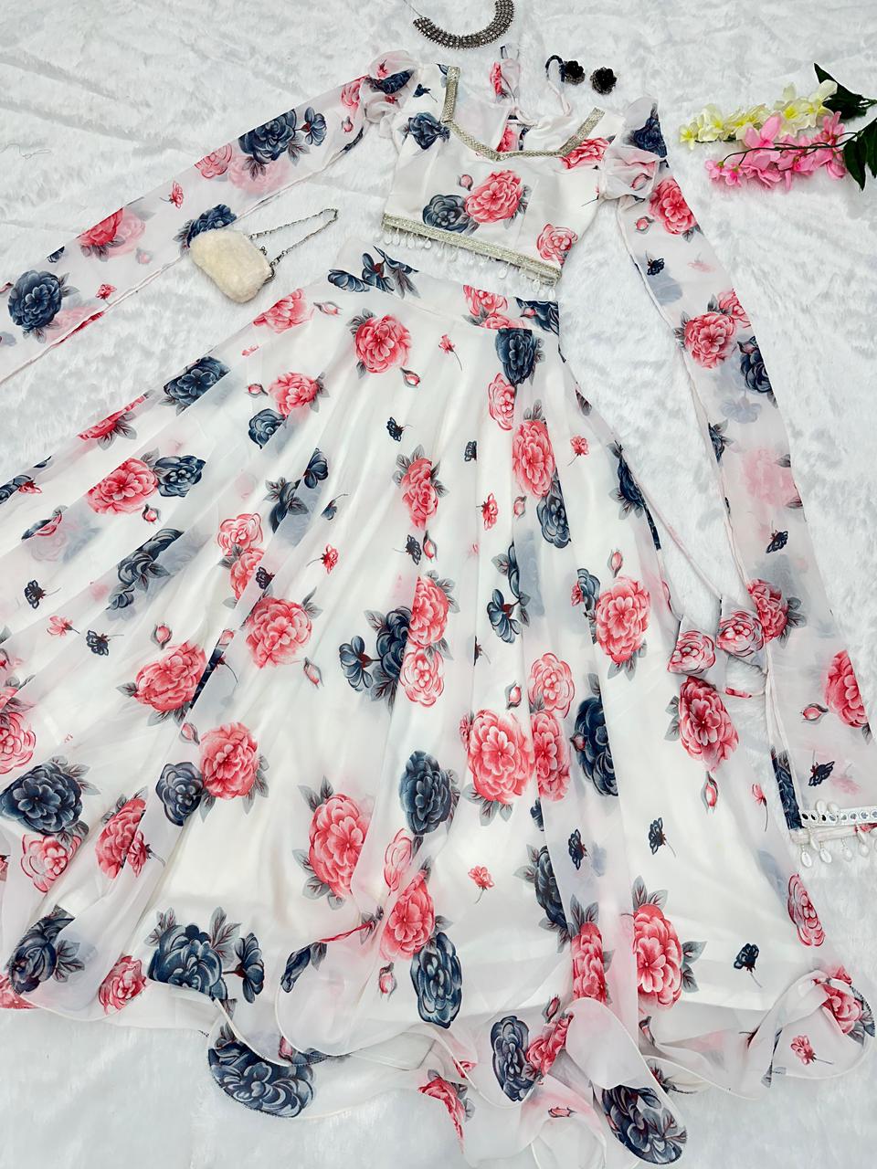 The printed georgette blouse comes fully stitched (size 38 with margin) and is enhanced with handcrafted designer lace work, adding a luxurious touch. The blouse design also carries an attached dupatta pattern, creating a cohesive and elegant ethnic look.
