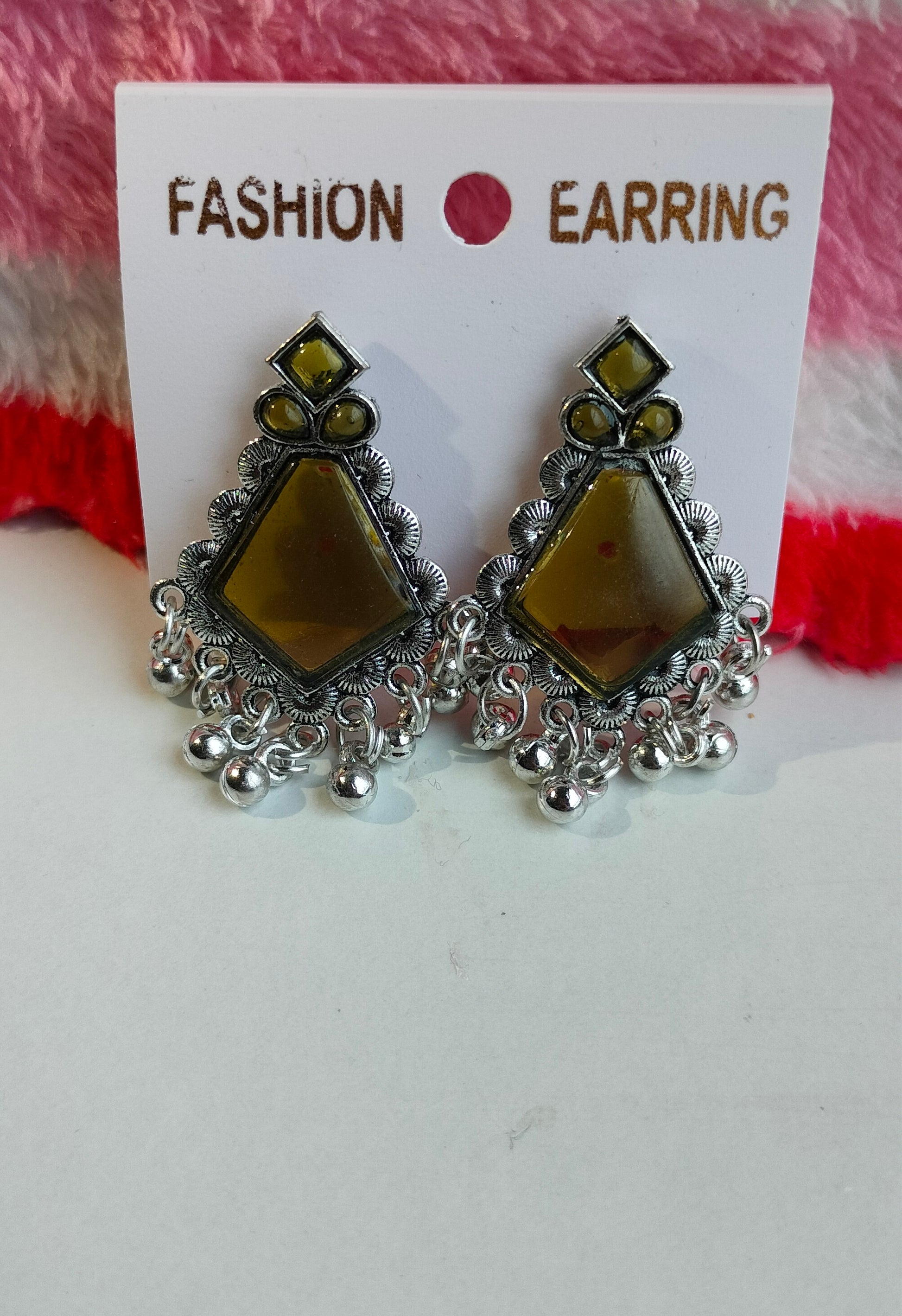These beautiful earrings feature a unique hexagon-shaped design, adorned with a vibrant mehendi green stone centerpiece and finished with delicate pearl drops, giving them a regal, handcrafted look. The oxidized silver polish adds a vintage touch, making them ideal for festive occasions, weddings, and ethnic gatherings.