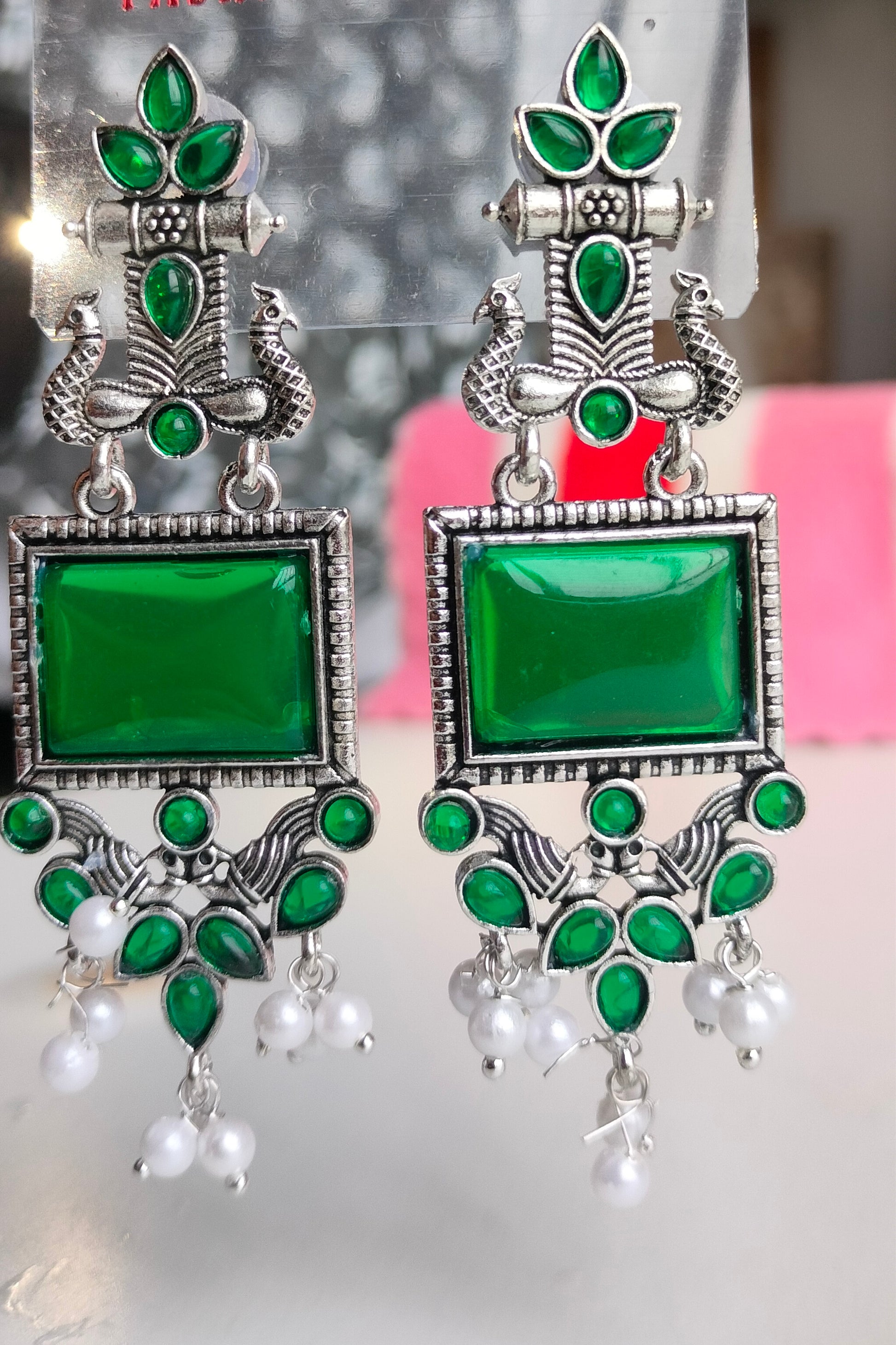 These earrings feature an intricately carved peacock motif, symbolizing beauty and grace, paired with a green stone centerpiece and delicate pearl drops that create a timeless ethnic statement. The antique oxidized silver finish adds vintage charm, making them ideal for pairing with sarees, kurtis, or Indo-western outfits.
