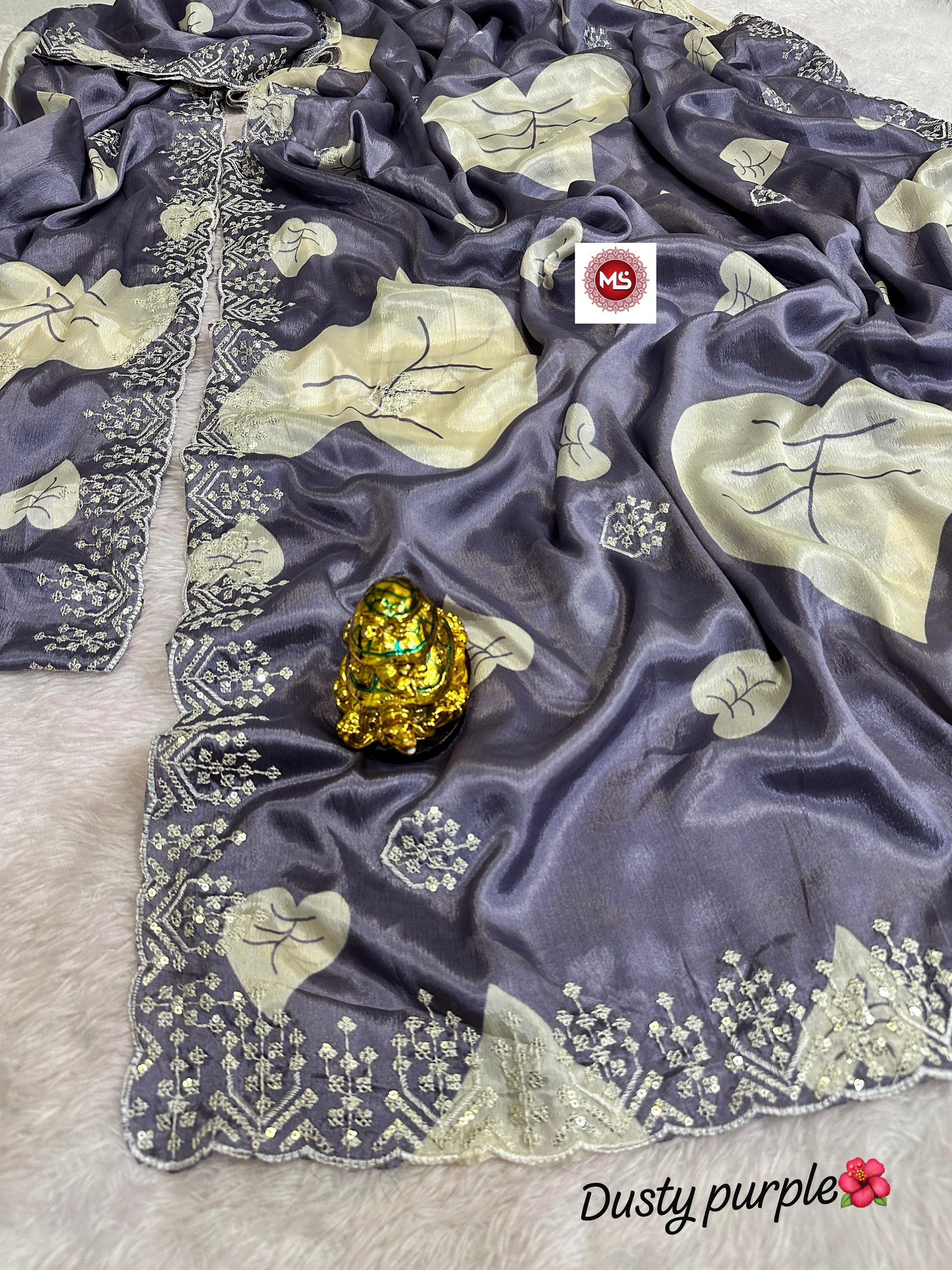 Premium Fancy Dusty Purple Colored Chinon Silk Sequin & Multi Embroidery Saree with Concept Pallu & Matching Blouse