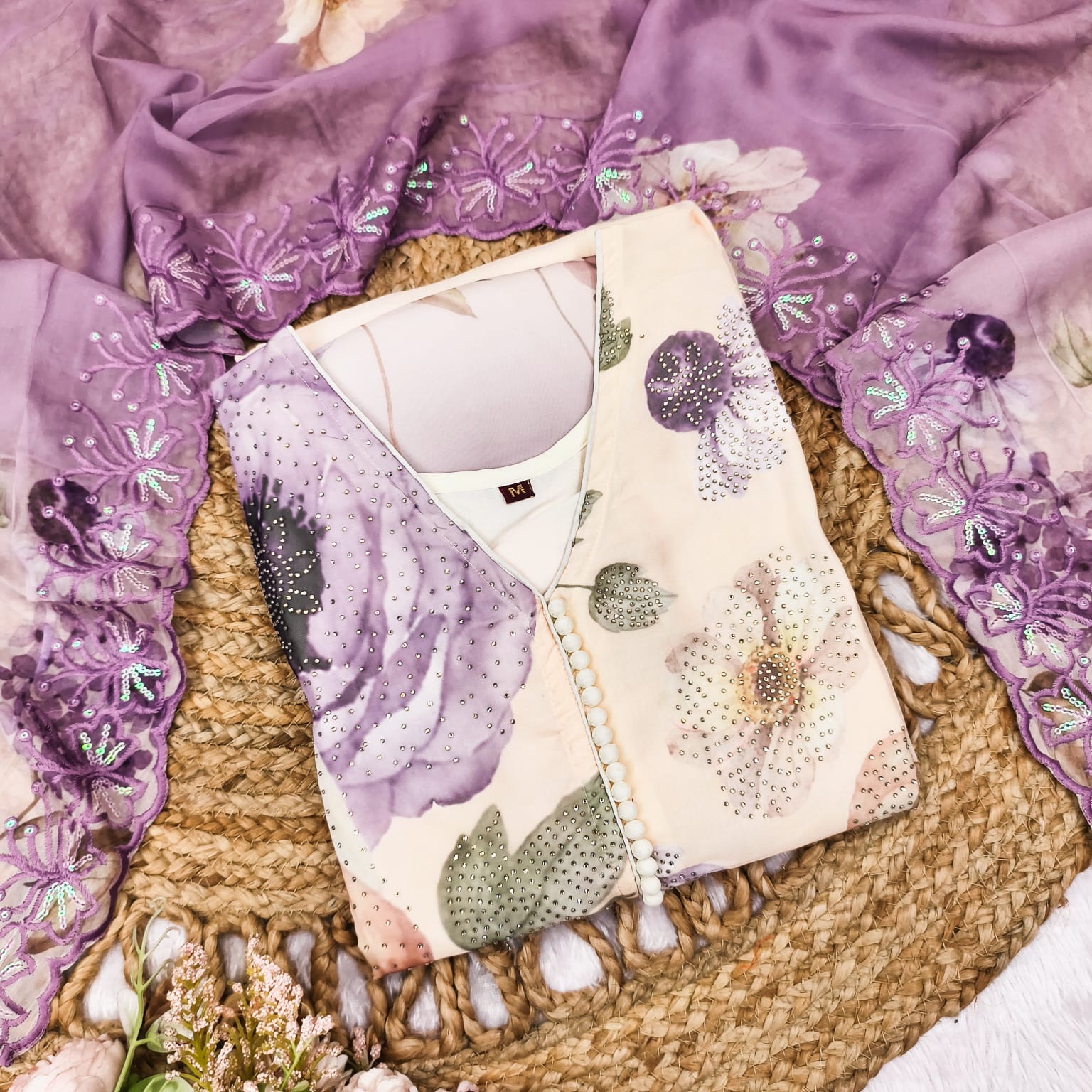 - Design: Vibrant Digital Floral Print with Stone Work on Neckline