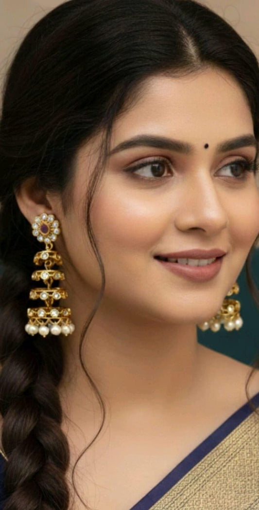 3 Layer Gold-Finish Jhumka Earrings with Pearl Drops